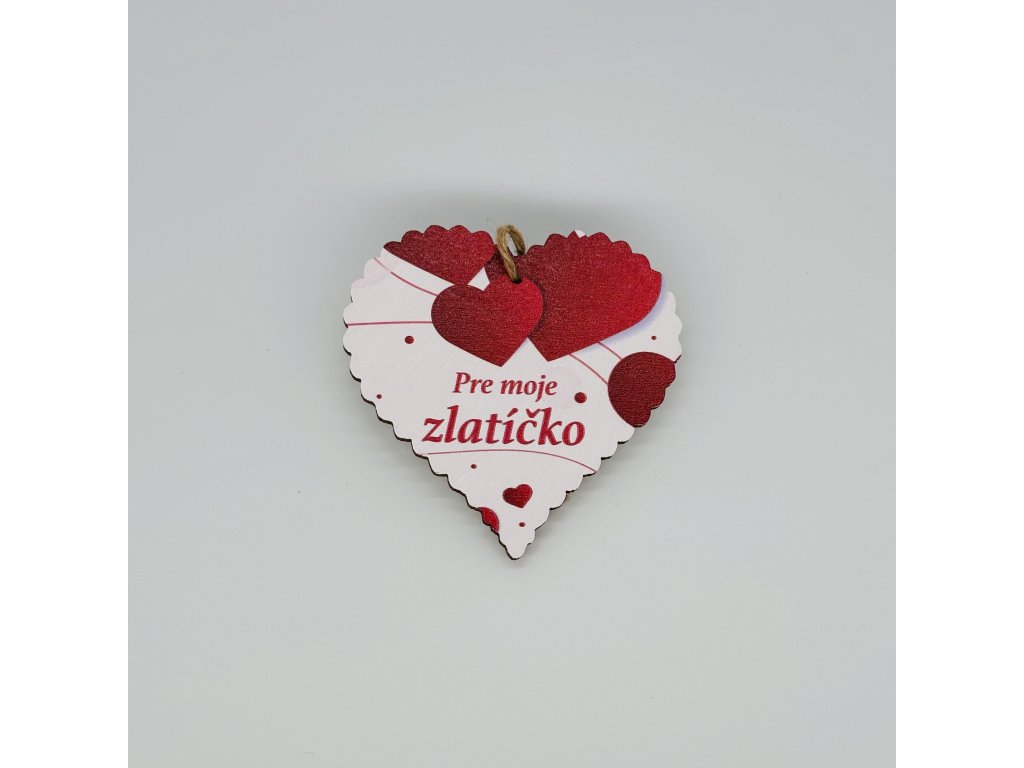 Tabuľka na zavesenie v tvare srdca s nápisom. Tabuľka je vyrobená z dreva.