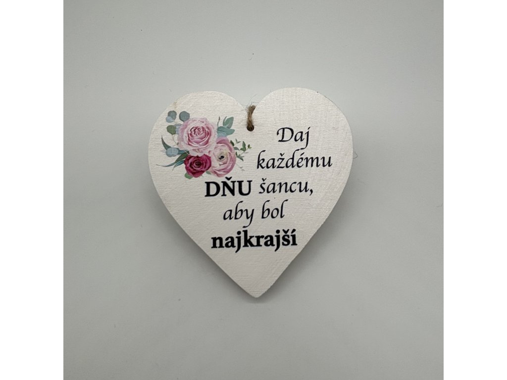 Tabuľka na zavesenie v tvare srdca s nápisom. Tabuľka je vyrobená z dreva.